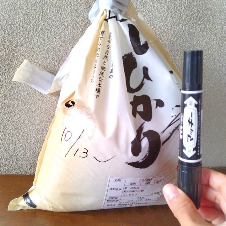 例えば、毎日必ず使う米。米袋に「いつ開けたか」の日付を入れておくことで、空になったときに「10日で消費したな」と、米の消費ペースがひと目で分かります。