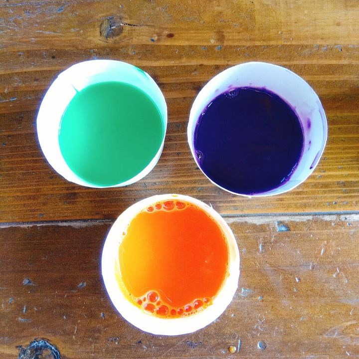 水に溶かした絵の具は、乾くと薄くなるので濃い色を出したい場合は、絵の具液を濃いめにつくるのがおすすめです。