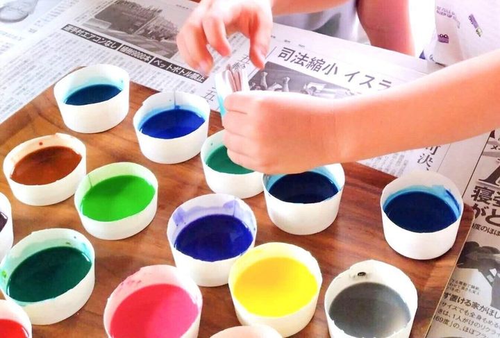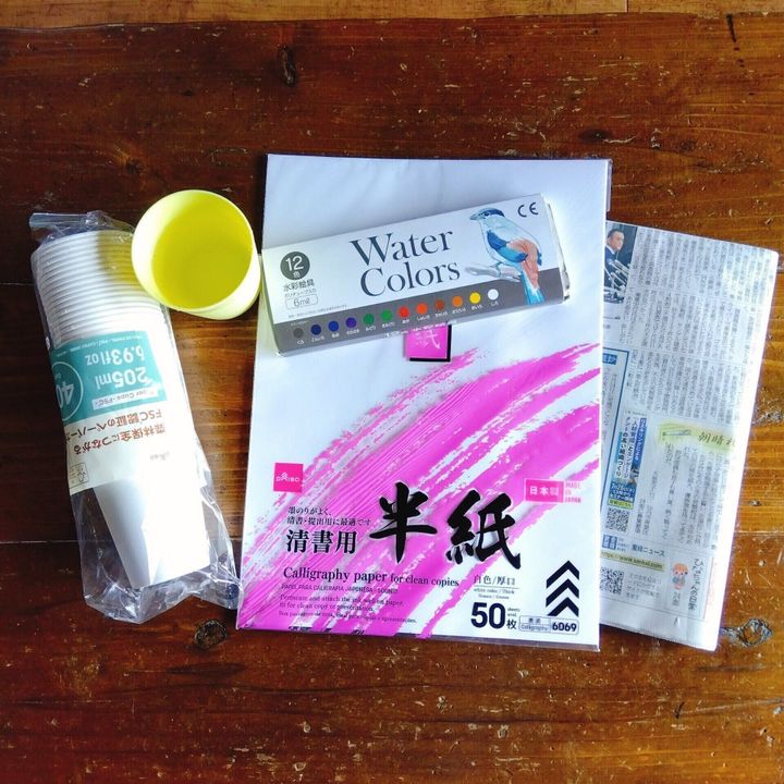 写真には映っていませんが、絵の具を水で溶かす用に綿棒や割りばしを用意してください。