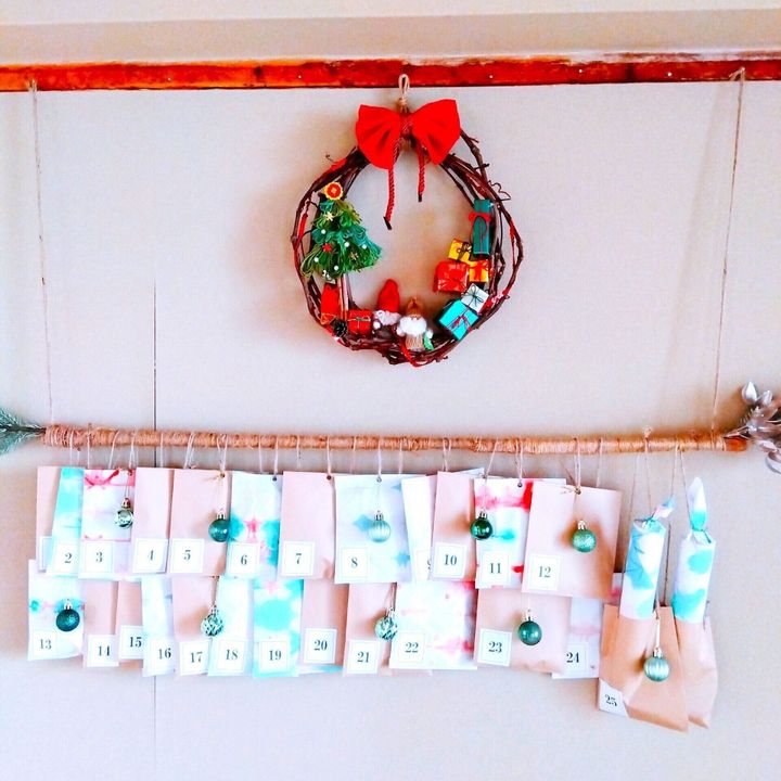 赤と緑を基調に色付けした「おり染め」は、クリスマスのアドベントカレンダーの包み紙に使いました。