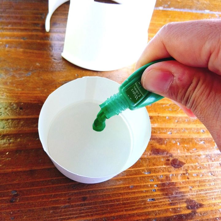 底から3センチのほどに切った紙コップに少量水を入れ、好きな色の絵の具を溶かします。