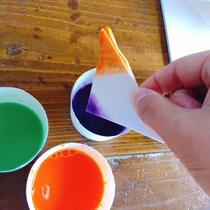中の方が色が染み込むのに時間がかかるので、絵の具液につけてから3秒ほど待つのがコツ。