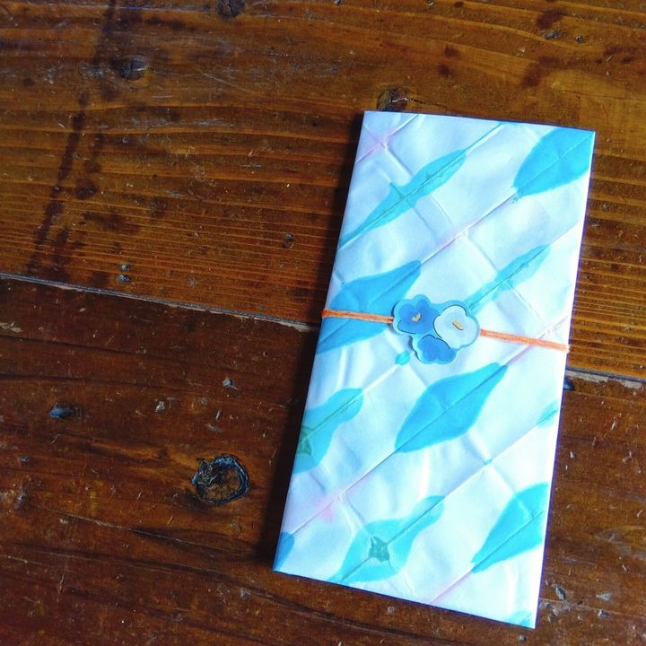新居を購入した友人へのお祝いも「おり染め」に包んでみると、華やかな印象になりました。オレンジの刺繍糸と、DAISOで購入したシールでちょっと「おめかし」もしました。