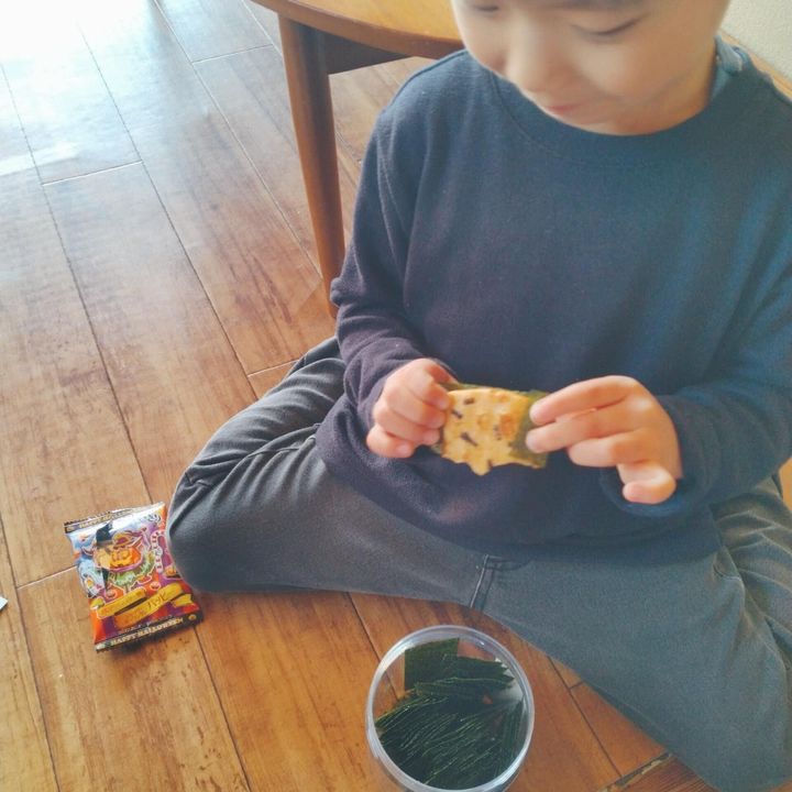 ある日、5歳の息子がおやつの時間に海苔を出してきました。もう片方の手には、大好きな「おにぎりせんべい」。