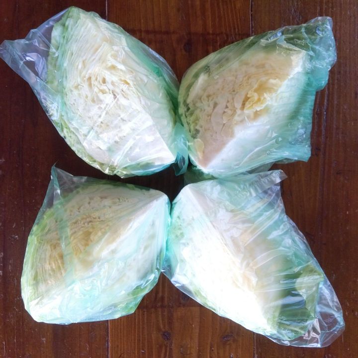 キャベツは、外葉から使うのが一番傷みにくいのですが、今回のキャベツは巨大過ぎたため、野菜室から取り出しやすいように4つ切りに。家にある鮮度保持袋に入るサイズにしました。