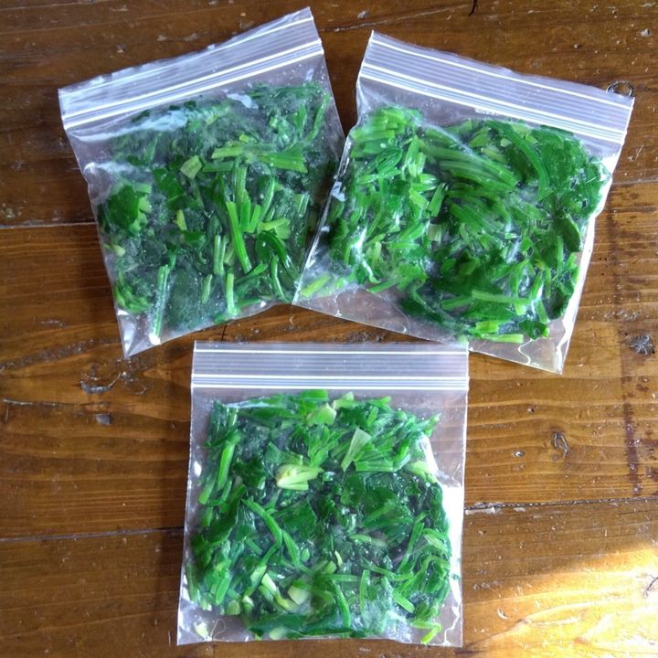 たっぷりのお湯で茹で、水にさらし、水気を絞った後に1口サイズにカットしてジッパー付きの袋に1束1袋の割合で保存。