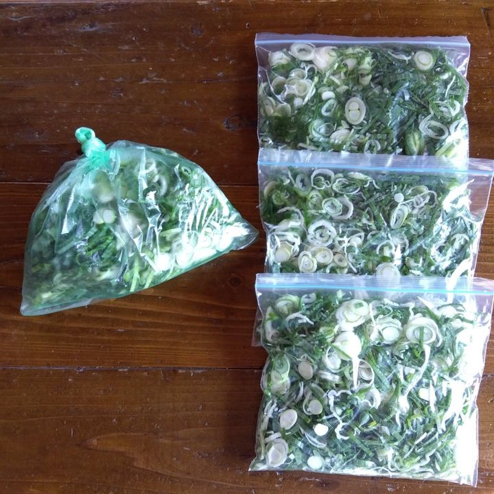 10日に1度しか買い物に行かないわが家では、おいしさを保つために下仁田ネギは小口切りにして冷凍保存しています。