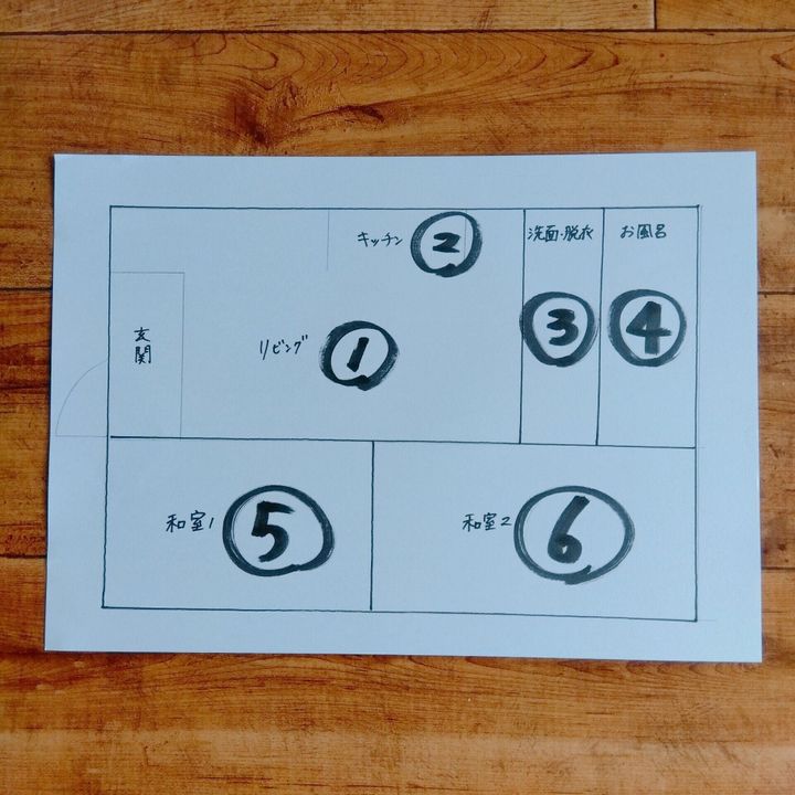 引っ越し先の部屋の見取り図(手書きでも可)に、リビングが「1」、キッチンが「2」というように番号をふります。