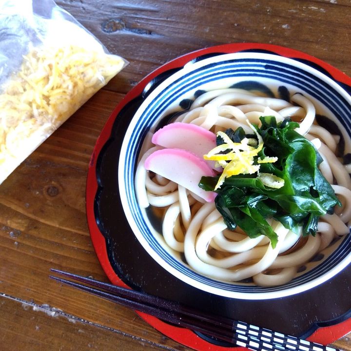 もちろん、普通の「お出汁」で食べてもおいしいうどん。冬はゆずの皮をトッピング。香りが良くて、大好きな冬の味です。
