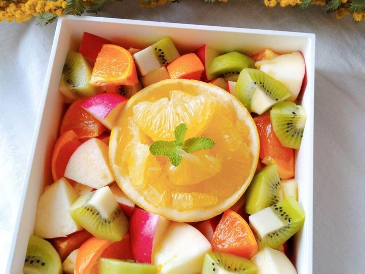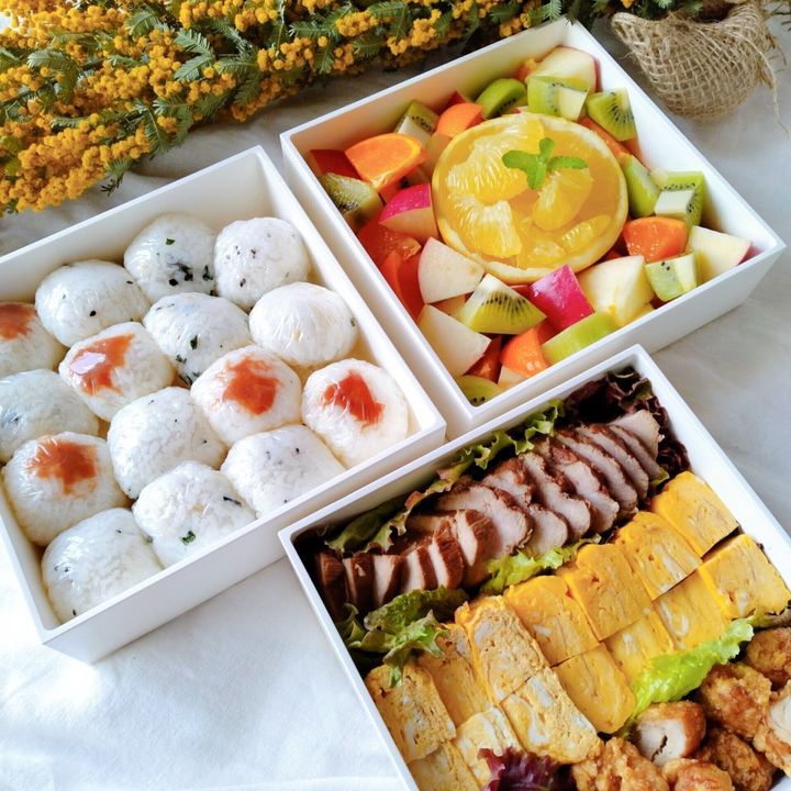 一段目は小むすび、二段目は冷凍からあげなどのおかず、三段目はフルーツのかんたんメニューでも重箱に入れるだけで、イベント感がアップします。
