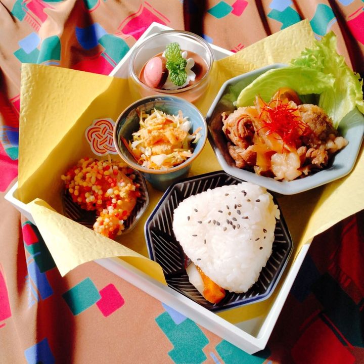包装紙と小皿を使って「おもてなし感」をアップ。おにぎり、野菜サラダ、レトルトの牛丼と、どれも「ふつう」のメニューですが、直接テーブルに置くのではなく、重箱に入れることで特別感のある雰囲気に。