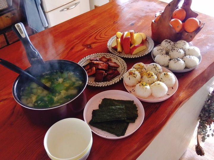 同じように、家族みんながそろう休日で「今日はダラダラする」と決めた日は、予め冷めてもおいしいおにぎりやおかずをテーブルに並べて、各自が食べたいタイミングで食べられるよう準備をしています。
