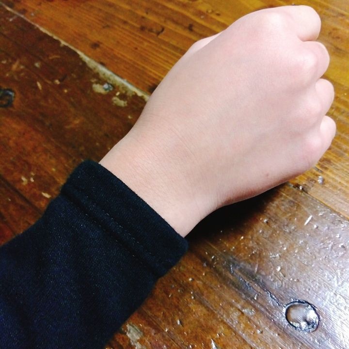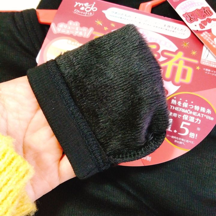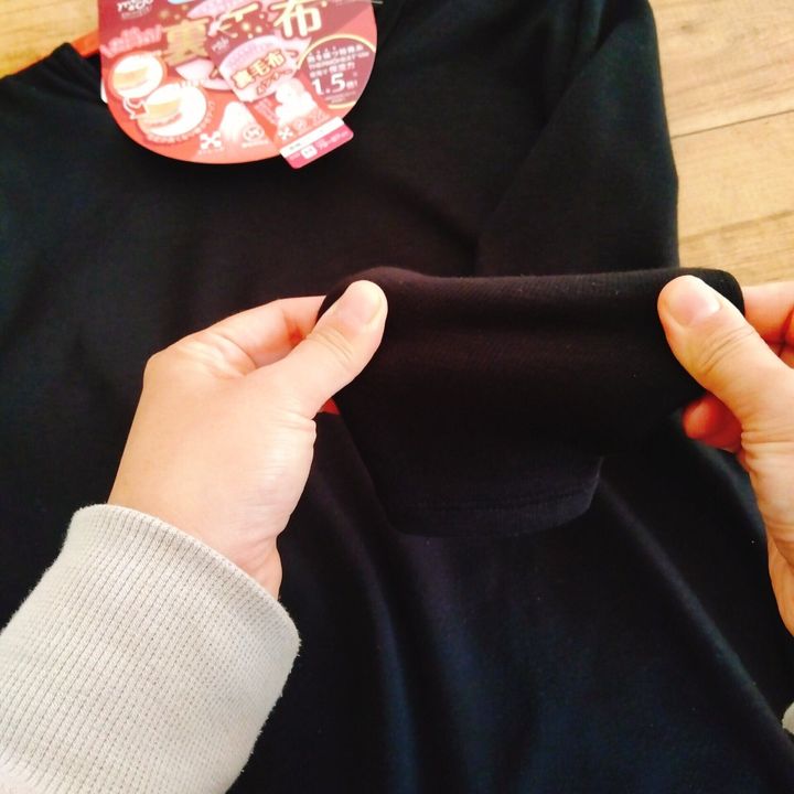 今まで着用していたインナーは手首までしっかり長さがあったので、袖口からインナーが覗いてしまうことも。そのため、わざわざ袖口から中のインナーが見えない様に折り曲げて着ることもありましたが、ドン・キホーテ「裏毛布インナー」1,428円(税込)は、ほんの少しだけ袖が短いのでオシャレ着に響くことがありません。
