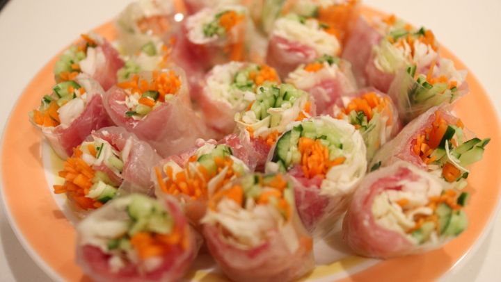 2.ライスペーパーを1枚ずつお湯で戻し、生ハム→野菜の順に巻いていく。