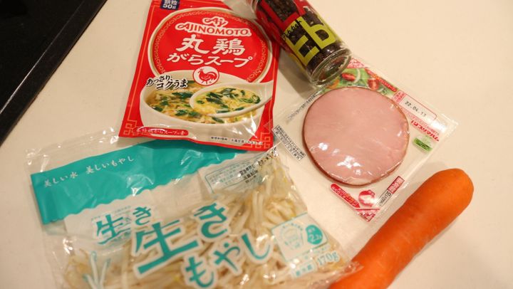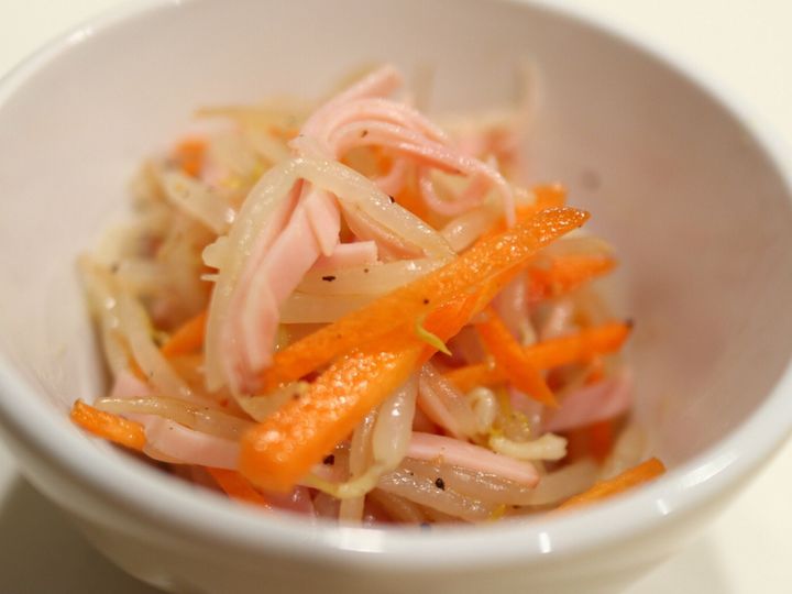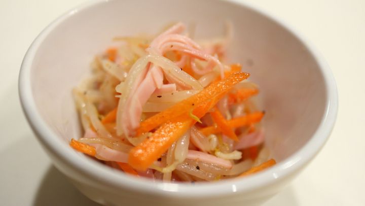 2.ハム、ニンジンは細めの千切りにして、ボウルに入れておく。