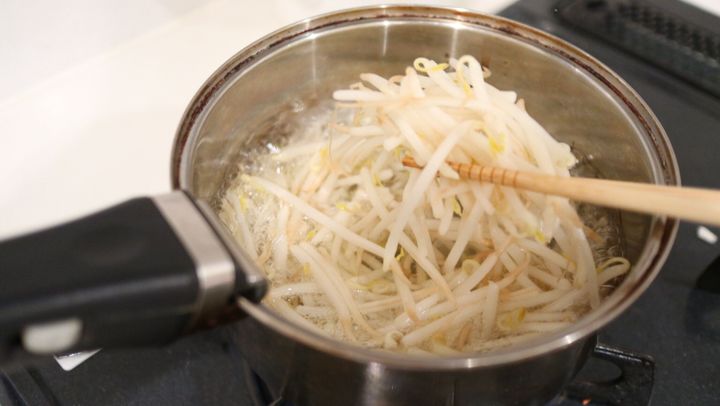 1.沸騰したお湯に塩を少々入れ(分量外)、もやしをさっと茹でる。茹で上がったらザルにあげ水気を切っておく。