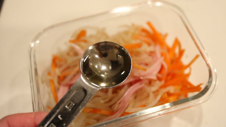 3.(2)のボウルに茹でたもやしを入れ、調味料を全て入れ味をなじませる。