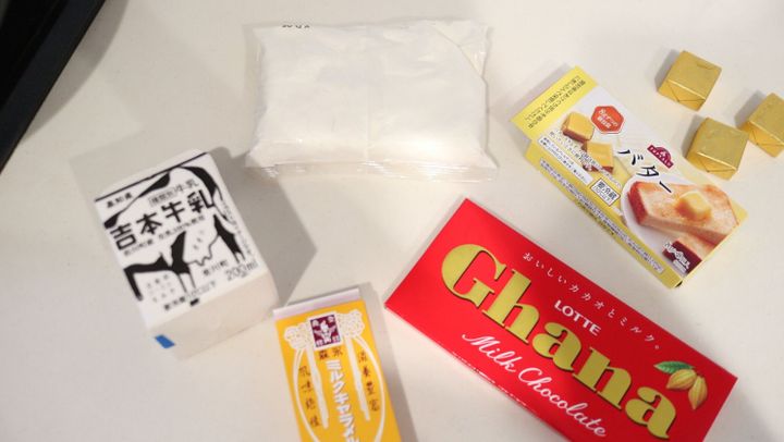 生地がポロポロしてきたら、牛乳・刻んでおいたキャラメル・板チョコを入れていきます。