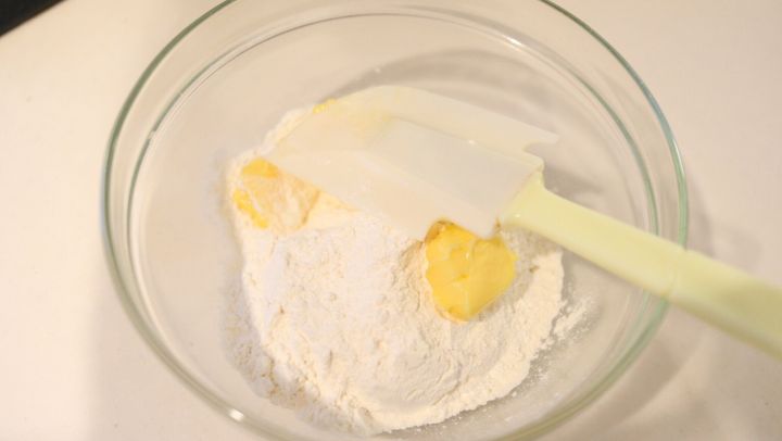 ボウルにホットケーキミックスを全量入れ、常温に戻したバターと混ぜ合わせます。混ぜる際は、【練らない】のがポイント!さくさくっとヘラで切るように、混ぜ合わせてください。
