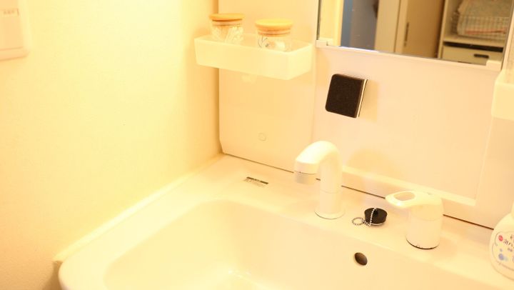スポンジは洗面台にセットして、すぐ手に取りやすいように。出しっぱなしにすることで乾きも早く、衛生的です。