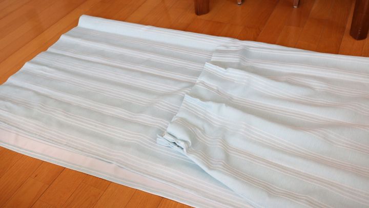まずはカーテンをフックごとカーテンレールから外します。それから、【フック部分が内側になるように】折りこんでいきます。(洗濯の際に引っかかり生地を傷めてしまうといけないので、必ず内側に折りこんで下さいね)