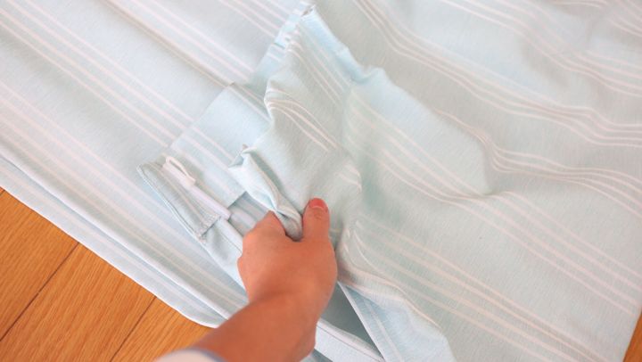 その後も、フックが内側に来るようにカーテンを折りたたんでいきます。なるべくしわができないように畳んであげると、洗い上がりも気になりません。