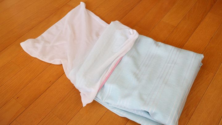 最後は、洗濯ネットに入れて準備完了!(ネットに入れることで、洗濯中に水流でカーテンが乱れて受けるダメージを抑えています)