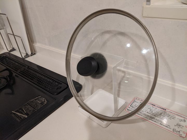 試しに、かなり重さがあるお鍋のフタを置いてみました。こちらも問題なく置けます!お鍋の蓋も、調理中に置く場所をとるキッチンツール。一つのスタンドで何通りもの使い方があり、とてもありがたい!