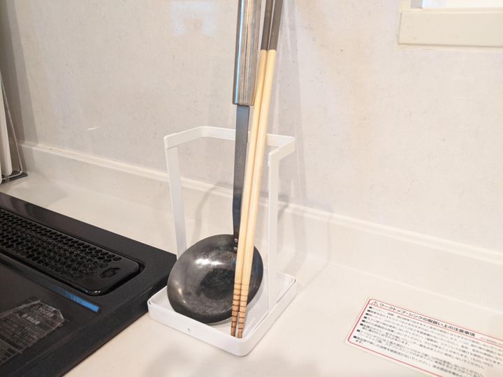 心配していた、キッチンツールを置いた際に不安定になるかという点。これは全く問題なし!お玉、菜箸両方立てかけられ、スタンドがグラグラすることもありません。