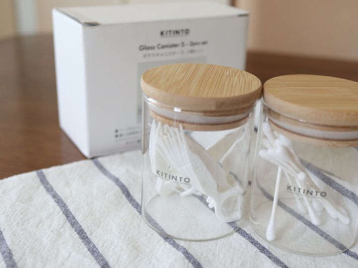 2個セットで330円なのですが、しっかりとした作りと、どのお部屋にもなじむシンプルなデザインで高見え…!ガラス製で中身が一目でわかるのも嬉しいポイントです。