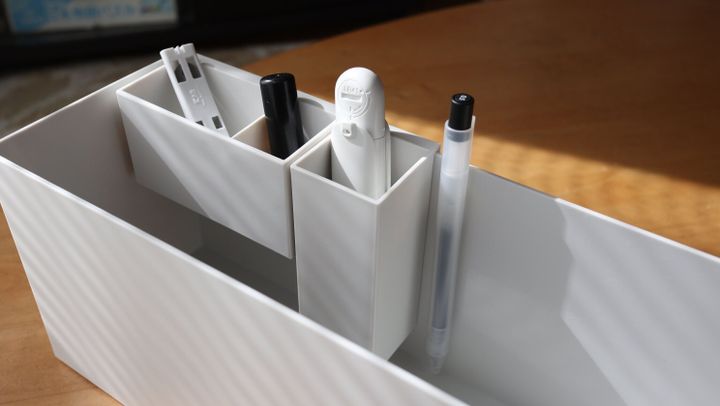 毎日、リビングテーブルに出しっぱなしにして、スムーズにおしたくが進むようにしています。我が家の子供達は書くことが大好きなので、ノートを収納したりも。