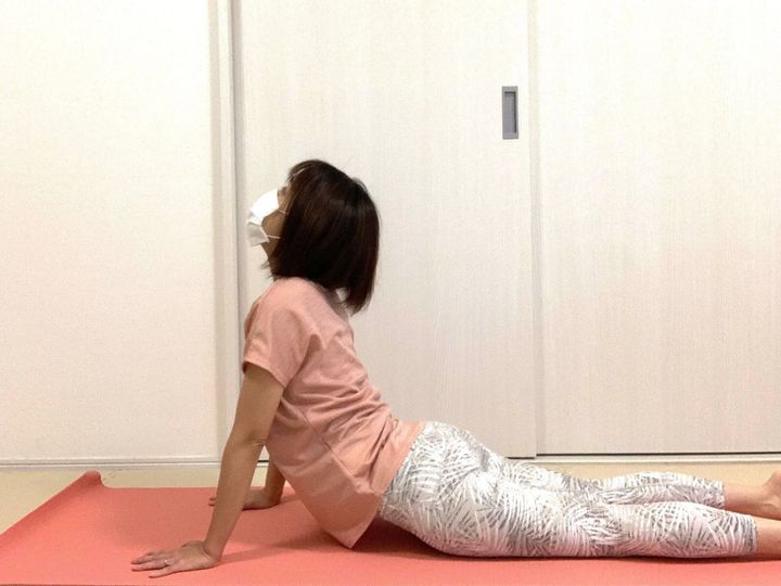 2.息を吸いながら上体をゆっくり持ち上げ、肘を伸ばす。