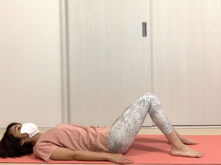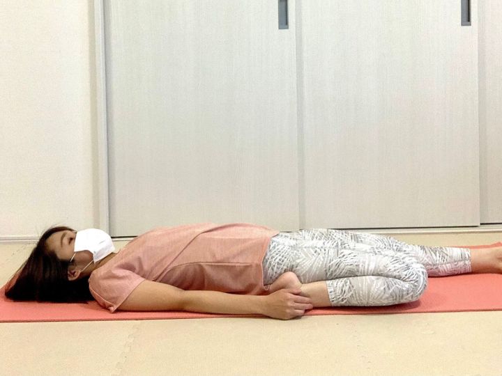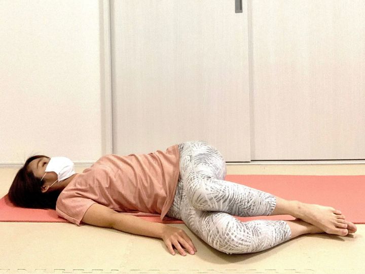 1.仰向けになり、左足は伸ばしたまま右足を曲げ、お尻の下に置く。