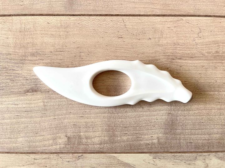 カッサのカーブ部分で、足首から膝裏に向かってほぐすとリンパの流れが良くなり、むくみの軽減につながります。