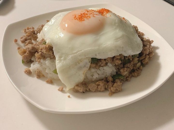 5、ご飯の上に乗せて、お好みで目玉焼きをのせる。