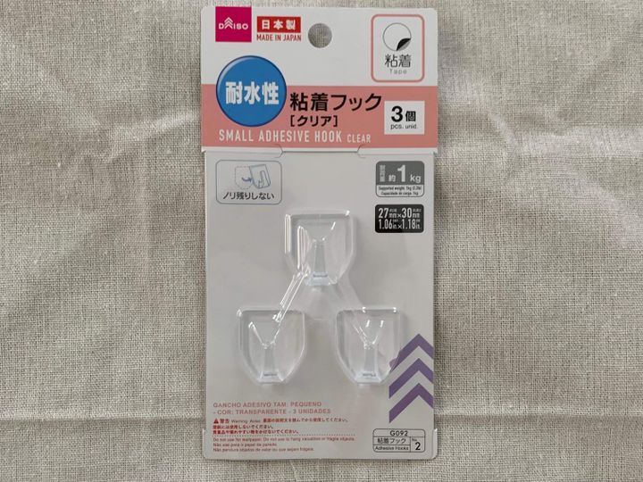 色がクリアで小さめのフックです。こちらは粘着タイプなので、シールの様になっています。