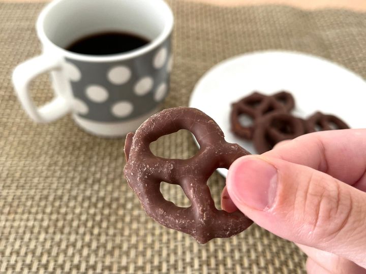 個人的には、ミルクチョコプレッツェルをすこし冷やして、ホットコーヒーと合わせて食べるのが好きです。