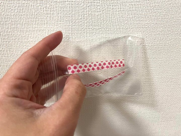 使用するのは、ダイソーで購入した厚手のチャック袋。カードや絆創膏、小物を収納するのにとても便利ですが、ポケットティッシュを入れるとピッタリ収まるのです。