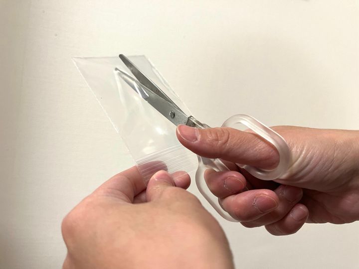 チャック袋の真ん中にハサミやカッターで切り込みを入れるだけ。ポイントは、両端を5mmずつ残すこと。