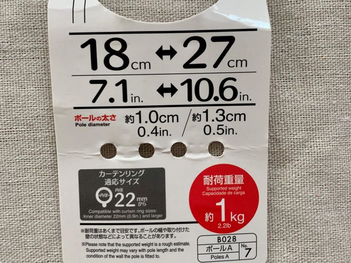 サイズはこちらです。耐荷重量が約1kgなので、ハンガーをぶら下げるのには十分です。