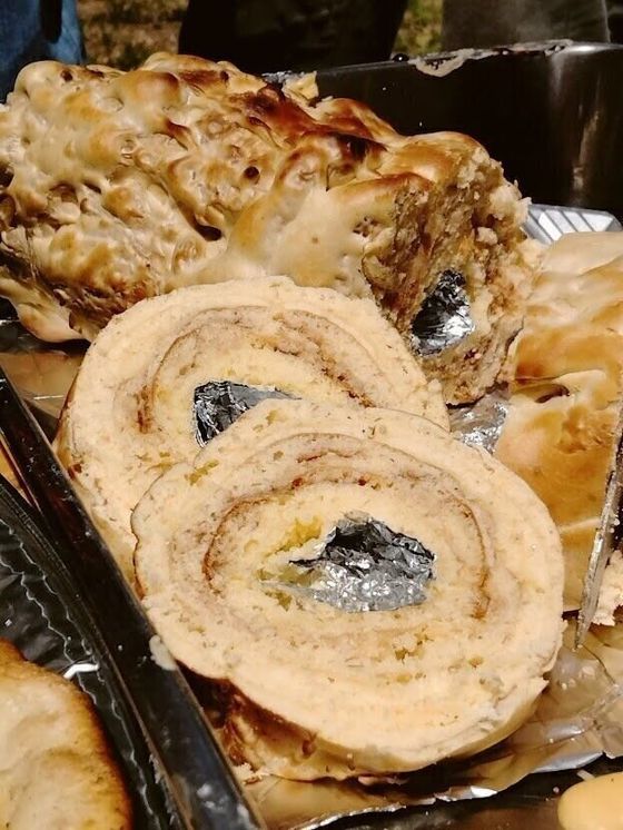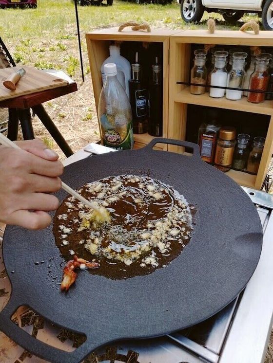 それを回しながら焼きます。焦げ目がついたら、層を重ねます。そして焼く。