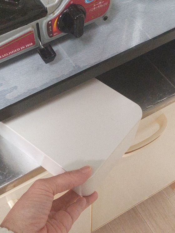 汚れが気になったらさっと掃除できるように、よく使うシートをガス下にセットしています。