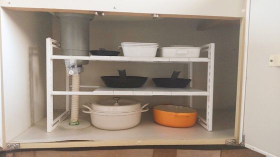 ツール類はまとめてスタンドに入れ、重たいフライパンなどはシンク下に収納しています。