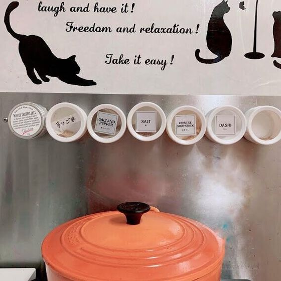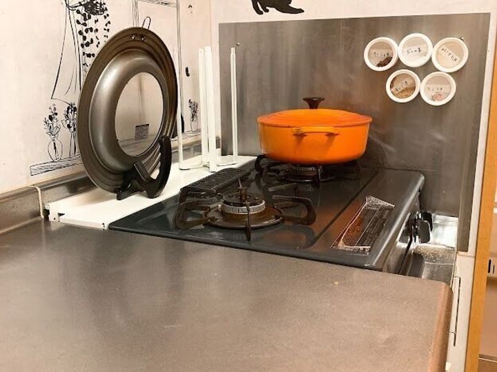 よく使う調味料はマグネット付きの保存容器に入れて、レンジ横の壁面に貼り付けています。