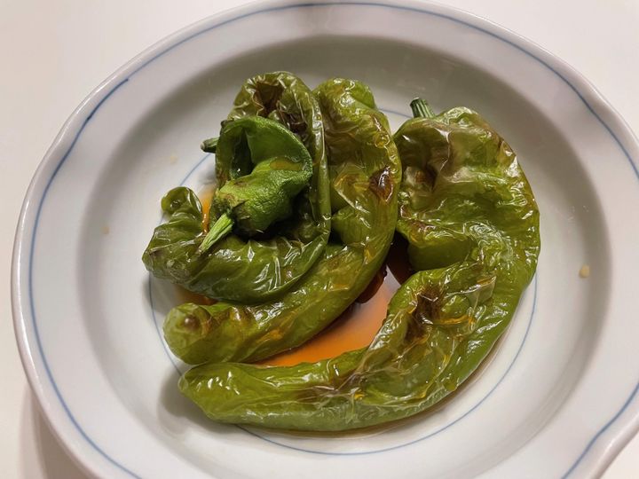 トースターで焼いた万願寺とうがらしをお皿に移して、麺つゆをかけて完成!
