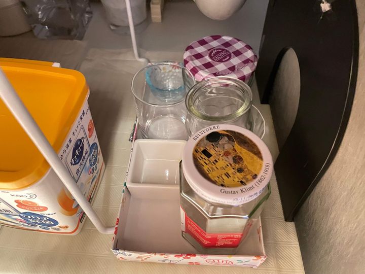 ジャムの空き瓶や細々としたガラスの器などは空き箱に入れてまとめて収納をしています。