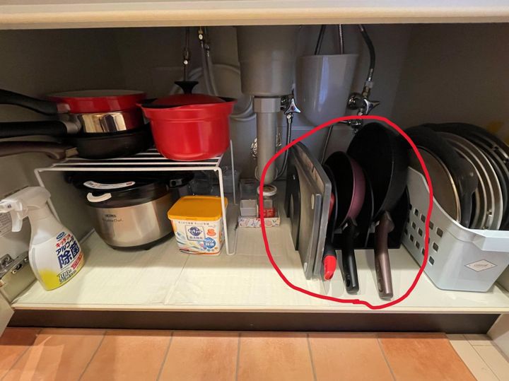 私は100円均一で購入したブックスタンドを使用してフライパンを収納しており、一緒にまな板も立てて収納しています。