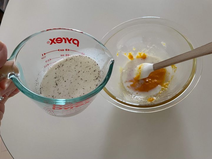 温めた牛乳にバニラエッセンスを入れて、ボウルに少しずつ足して生地をならします。