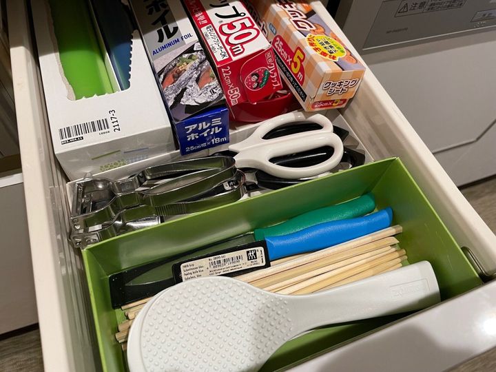キッチンの引き出しにこのように箱を入れれば、100均で収納ボックスを買わずとも、小分けにキッチンバサミやしゃもじなどを収納することができます。