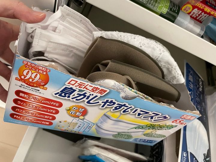 全然おしゃれでないマスクの箱も、蓋を切ってしまい、洗えるマスクの収納に再利用しています。